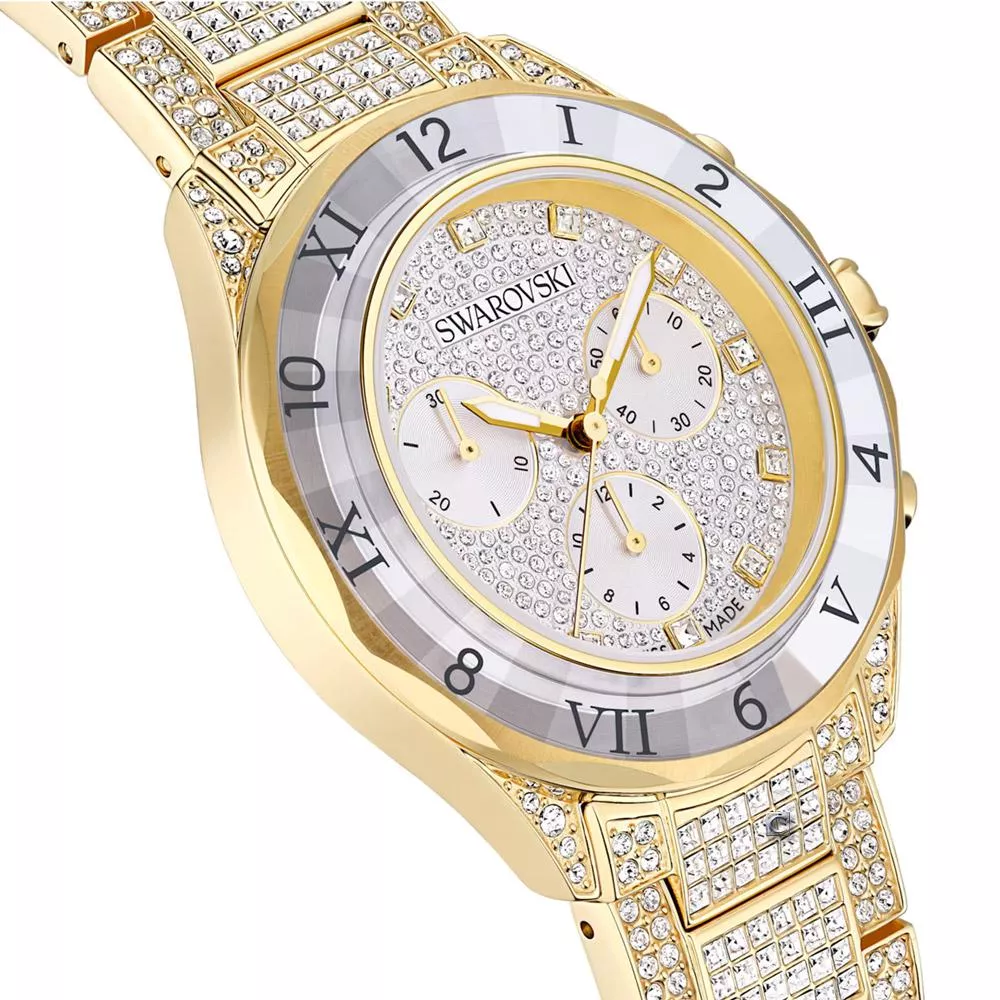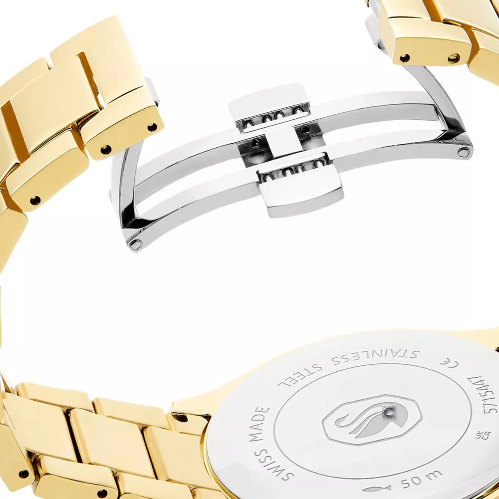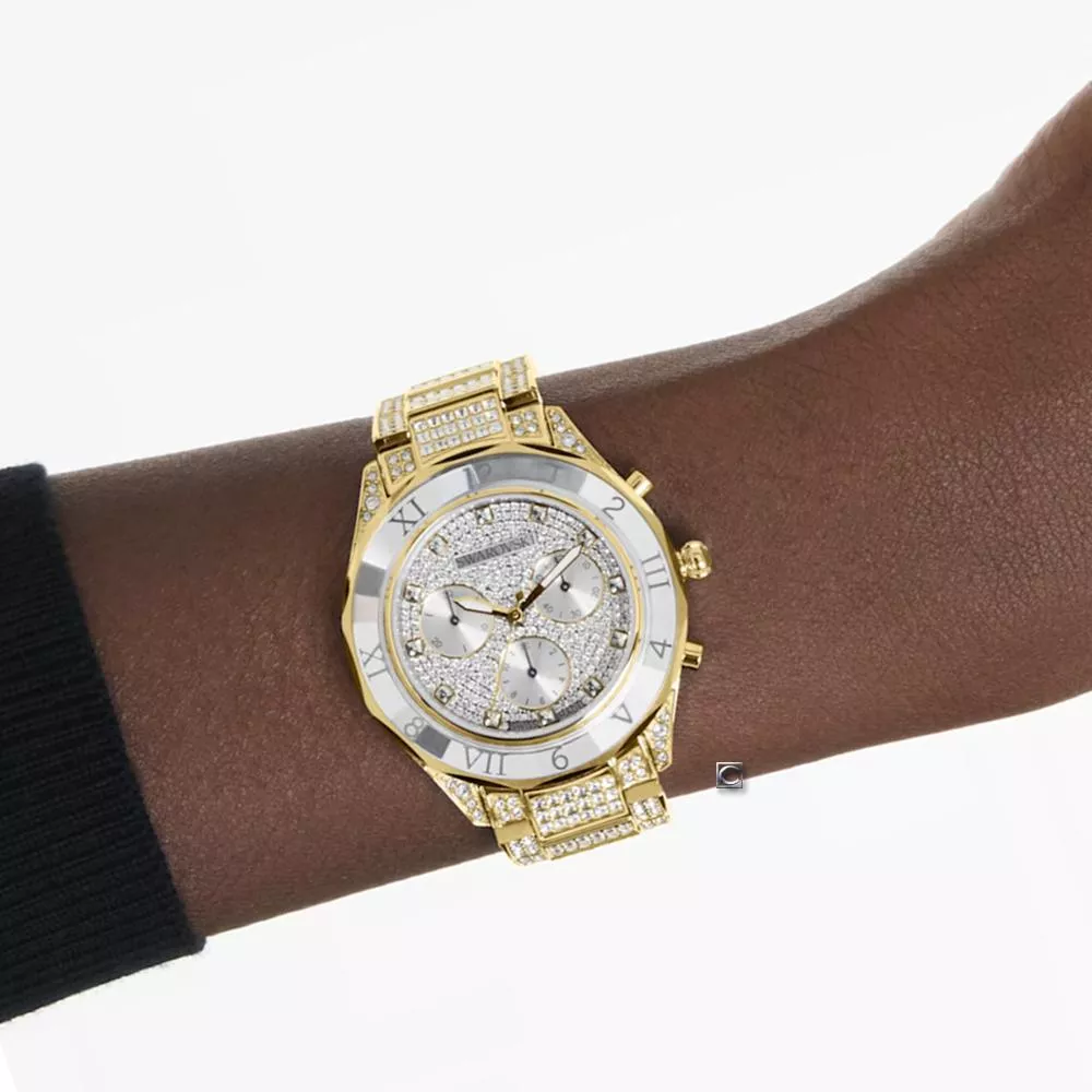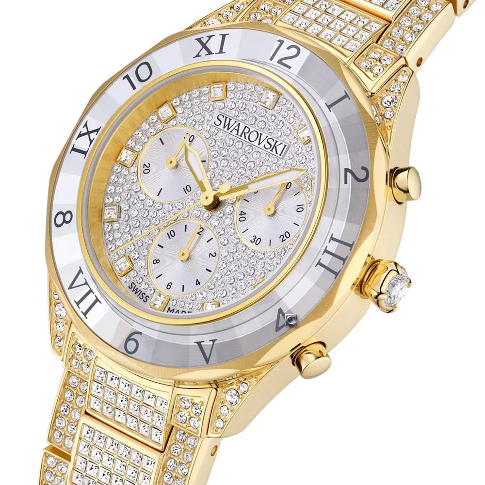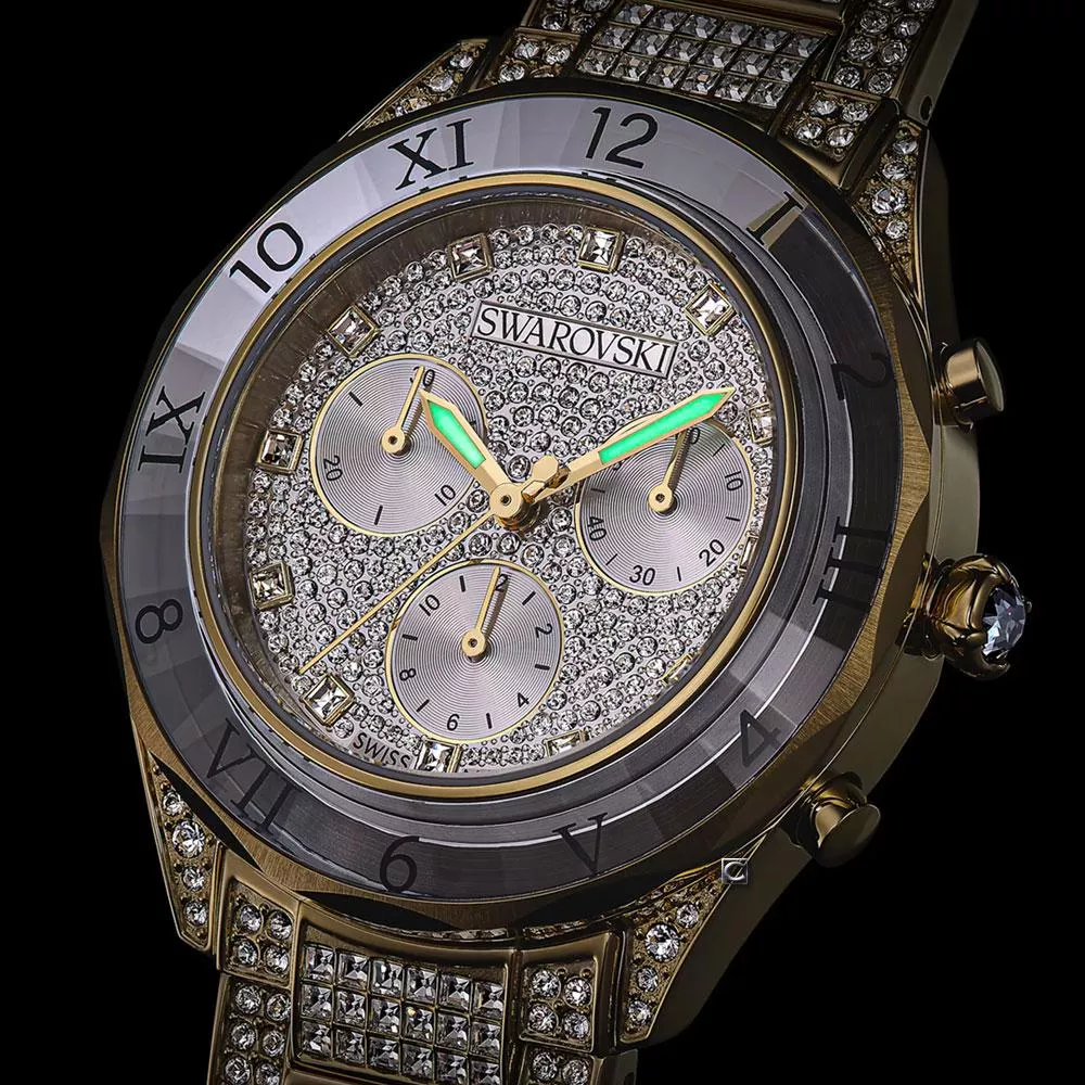 款滿佈寶石的 Dextera 時計是對 Swarovski savoir-faire(精湛工藝)的閃亮頌歌,時時刻刻都散發璀璨光芒。40mm 不鏽鋼錶殼採用金色調飾面,並安裝切割面錶圈,經過切割處理,反射耀眼光芒。最引人注目的是計時錶盤飾有約 240 顆圓形切割 Swarovski 水晶,和三個小錶盤,包括分鐘計時盤、秒計時盤和小時計時盤。為綻放最閃耀的光芒,指針標示使用單顆 Swarovski 水晶,並搭配螢光指針。錶殼本身鑲有 16 顆 Swarovski 水晶,錶冠鑲嵌單顆 Swarovski 水晶,而不鏽鋼錶鏈則飾有約 492 顆 Swarovski 水晶。這款瑞士製錶款防水深度達 50 米,散發歡樂的奢華感。