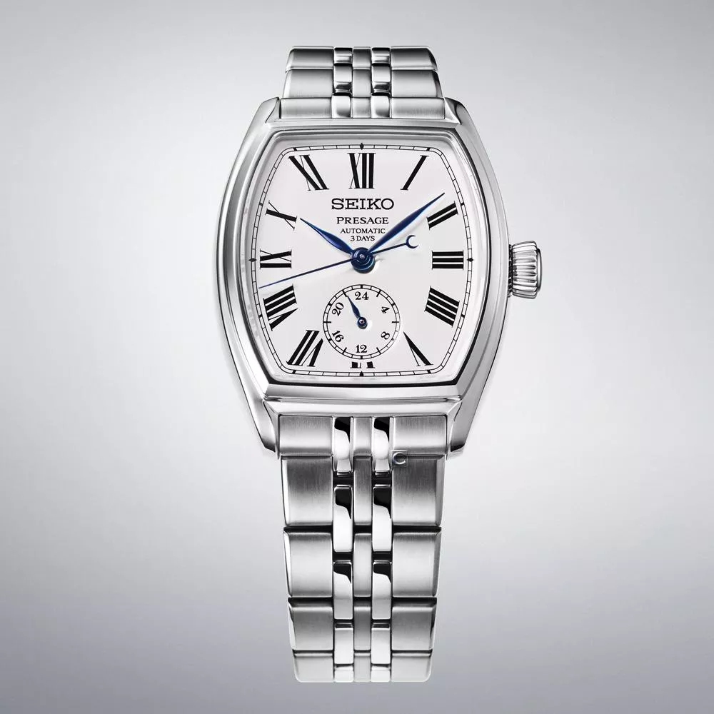 精工將迎來145週年慶典,並推出Presage經典系列琺瑯工藝SPB537腕錶,繼續詮釋過去與現在的對話。這款全新腕錶的設計靈感源自2017年的Presage系列錶款,更追溯至精工首款懷錶-傳奇的Timekeeper懷錶,將復古韻味與現代風格完美融合。三針腕錶採用酒桶形精鋼錶殼,直徑略小於36毫米,厚度12.5毫米。錶盤中央為白色琺瑯材質,其溫暖的光澤展現出琺瑯材質特有的深邃質感和精緻格調。醒目的黑色羅馬數字時標、軌道式分鐘刻度、6點鐘位置的24小時顯示以及藍鋼指針,與錶盤形成鮮明對比。
