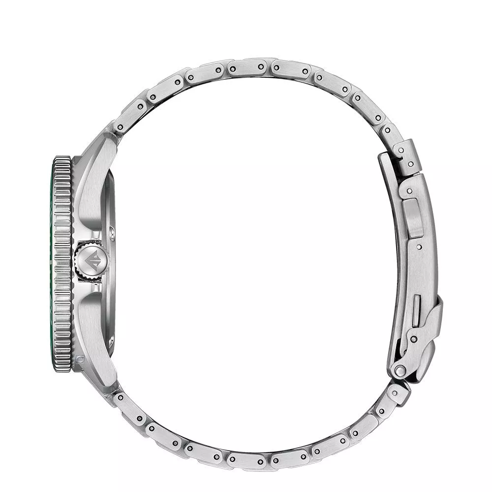 這款潛水腕錶採用經典設計,40.6毫米錶殼配戴舒適。旋轉錶圈採用經典飾面,全週略帶凹槽,操作便利。三片式金屬錶帶採用獨立中心鏈節和鏡面斜面設計,打造出強烈的立體立體感。錶扣採用棘輪式雙扣設計,即使穿著潛水衣也能輕鬆調整和扣緊。錶盤從中心向邊緣呈現漸層色,令人聯想到清澈的海洋深處。錶盤簡潔而優雅。