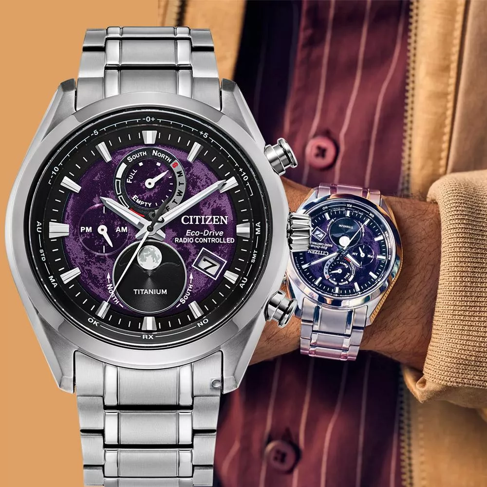 突破性科技與精妙設計相遇,Tsuki-yomi A-T腕錶便應運而生。它是西鐵城首款融合原子計時技術的月相腕錶,其卓越品質令人嘆為觀止。腕錶的設計靈感源自月球表面,6點鐘位置的視窗可顯示目前月相。 43毫米銀色Super Titanium™錶殼,棱角分明的切割邊緣與整體精緻的設計相得益彰,在腕間盡顯奪目風采。深紫色錶盤搭配黑色點綴和銀色飾件,美觀又清晰易讀。除了運行時間顯示外,這款腕錶還具備月相顯示、24個時區的世界時間、萬年曆和日期星期顯示功能。它採用西鐵城獨有的光動能技術,無需電池即可利用光能提供動力。防水深度達100公尺。機芯型號為H874。
