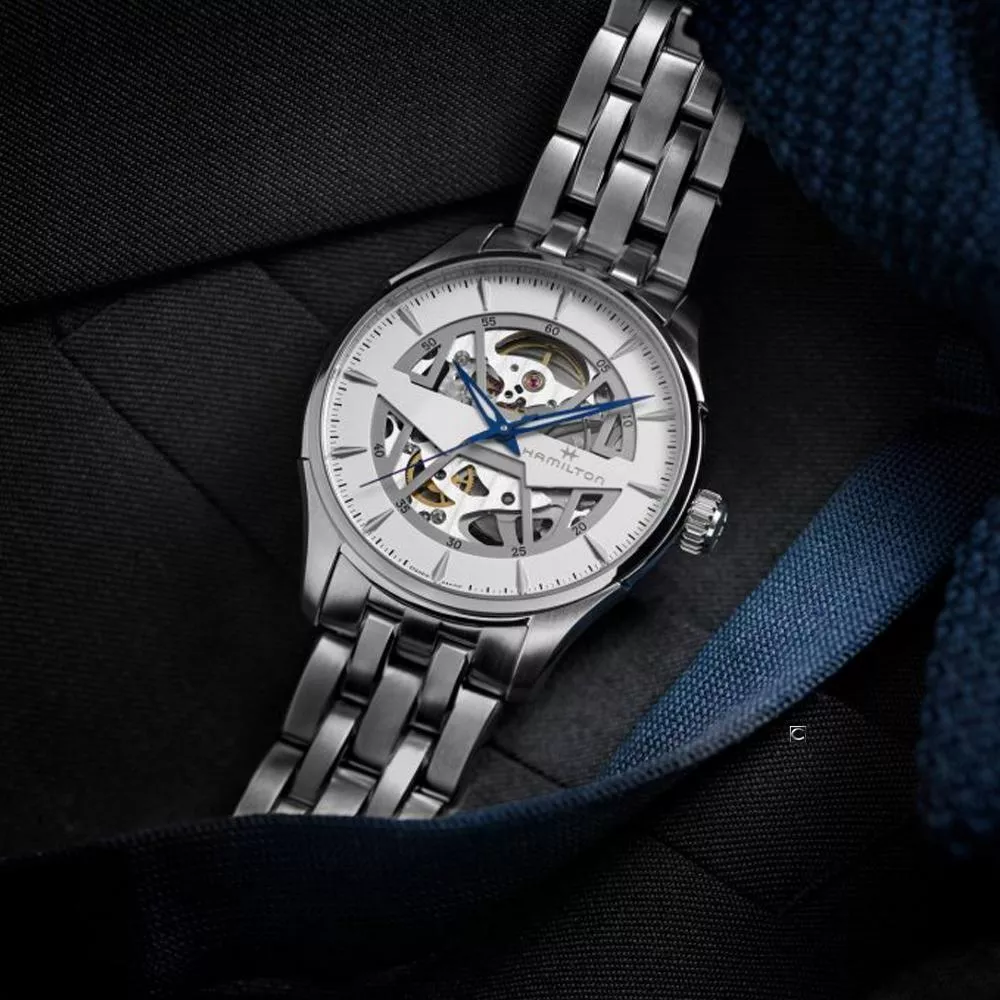 Jazzmaster Skeleton腕錶融合精準與瑰麗的設計。這款腕錶獨特而迷人,鏤空錶盤融合Hamilton漢米爾頓大膽鮮明的設計特色,透過錶盤更可清楚看見極為精密的內部裝置。