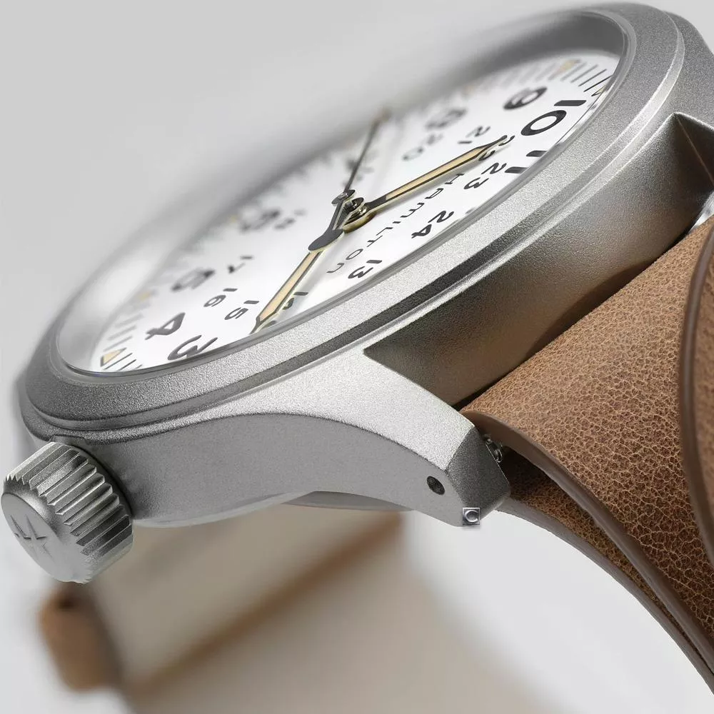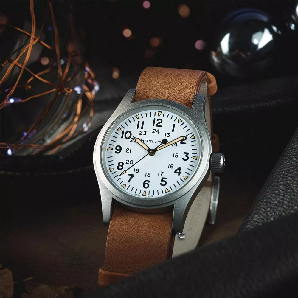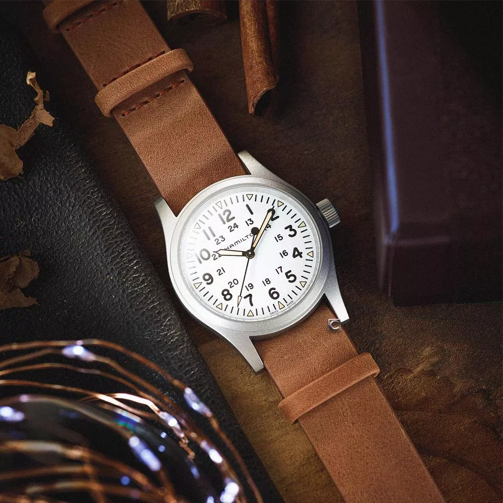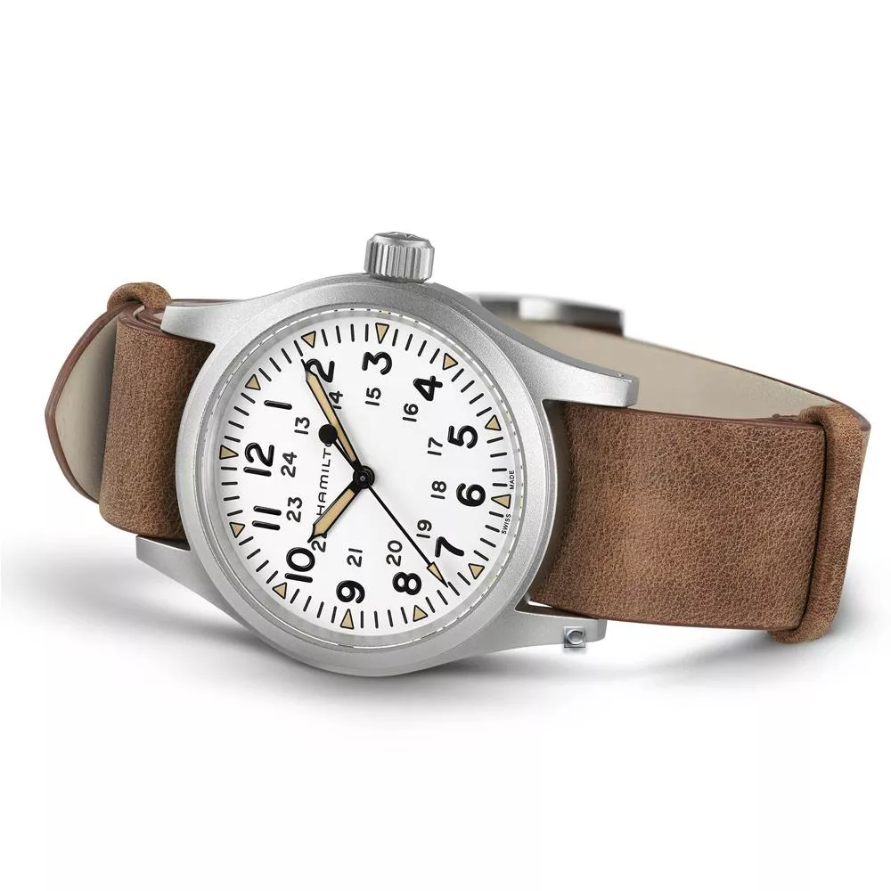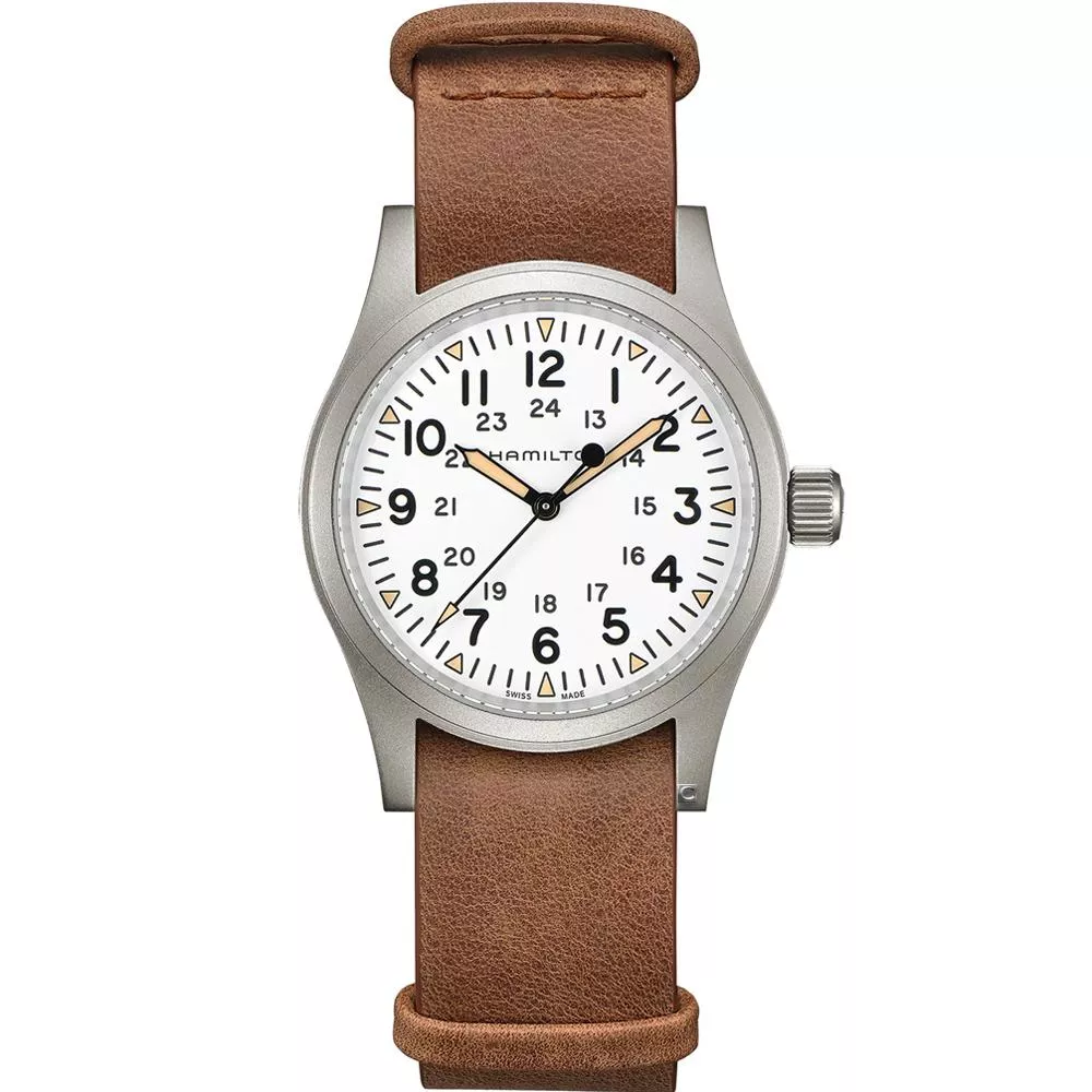 38毫米啞光精鋼錶殼、三指針顯示、白色錶盤、覆有經典鐳色Super-LumiNova®夜光塗層的三角形時標、耐用的NATO錶帶:全新Khaki Field Mechanical腕錶,忠實再現1960年代的原版之作,秉承Hamilton漢米爾頓軍事傳統。腕錶為原創軍用腕錶,啟發自軍事傳統,設計堅固耐用。 此款Hamilton漢米爾頓皮革錶帶由天然材質製成。皮革經過鞣製,但未經處理、染色,或經過如其他皮革錶帶的修飾。這樣可保留皮革的天然外觀,亦令每條錶帶都不盡相同、獨一無二。