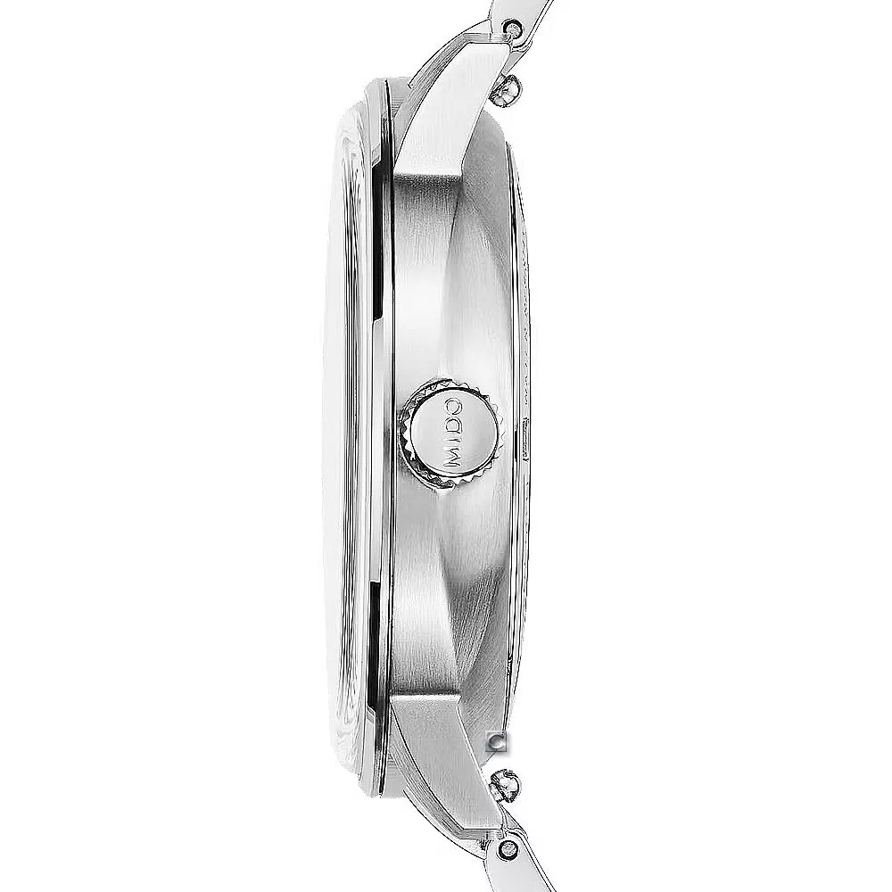 這款 Commander Datoday 完美體現了 MIDO 美度表 的品牌精神。太陽放射紋磨砂錶盤搭配階梯式內圈,與重新設計且塗覆 Super-LumiNova® 夜光塗層的指針和時標相得益彰,襯托出標誌性的日期星期窗。 從一體成型錶冠、 Commander 系列經典形狀的絲光磨砂不鏽鋼錶殼,到箱型藍寶石水晶玻璃鏡面,以及配備快拆系統的不鏽鋼鍊帶,皆是將永恆優雅與現代精準技術完美結合。這是一次對經典 Commander 系列的當代重新演繹,致敬其橫跨超過六十年的傳奇輝煌。