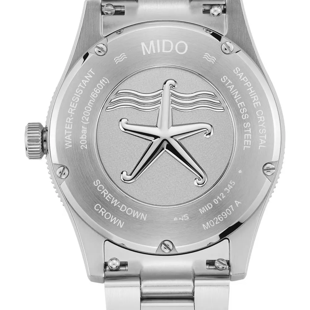 搭配完美的39毫米直徑且結合纖薄的錶殼,標誌著海洋之星系列的重要突破。這款自動腕錶的美學特色體現在其獨特且具有辨識度的浮雕錶盤上,巧妙呈現海水在海床上刻劃出的波紋。防水深度可達200米,其旋入式錶背上鐫刻品牌標誌海星圖案,象徵著MIDO在防水技術方面的悠久製錶專業。