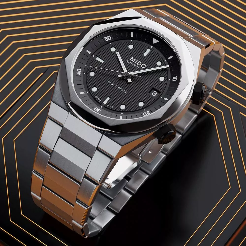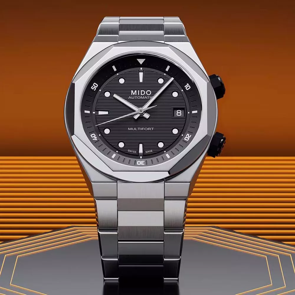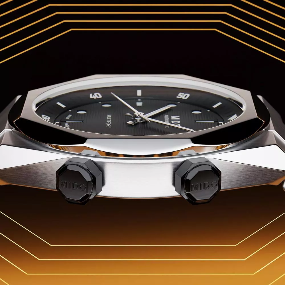 Multifort 8以其大膽創新的設計改變了遊戲規則! 這款腕錶的動感現代外觀搭配八角形錶圈,橫向浮雕錶盤設計進一步凸顯,時標和指針均經白色Super-LumiNova夜光塗層處理,無論白天還是黑夜,都能輕鬆讀時。這件珠寶般的作品將技術與幾何美學設計完美融合,配備內部旋轉錶圈,透過2點鐘位置的錶冠操作,而時間與日期則可透過4點鐘位置的錶冠設定。此錶款搭載Calibre 72機芯,並結合Nivachron™技術,特別選擇其纖薄設計,展現出40毫米的纖巧與優雅。