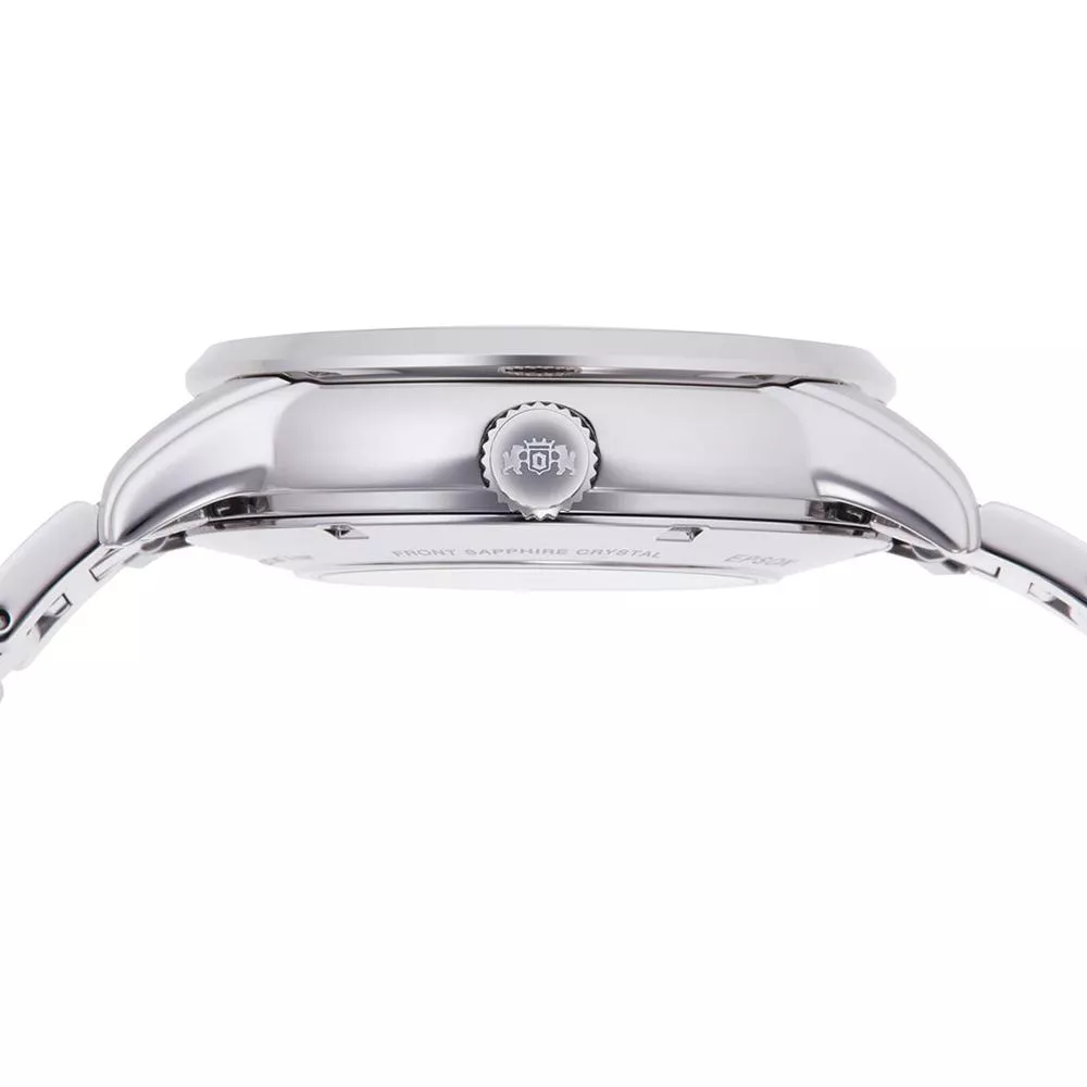 這款來自我們廣受歡迎的日月半鏤空系列的時尚機械腕錶,融合了現代設計與經典風格。標誌性的日月小錶盤位於6點鐘位置,9點鐘位置則設有半鏤空設計,兩者均置於醒目的黑色錶盤之上,並以精鋼錶殼和弧形藍寶石水晶玻鏡面加以襯托。這款精緻的時計還配備了銀色羅馬數字時標、時尚的銀色柳葉形指針和經典的銀色錶帶。