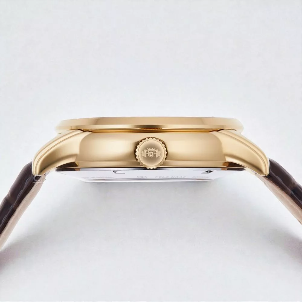 來自東方日月系列的精美時尚腕錶。其內部搭載了東方錶自產的日本製造自動上鍊機芯 F6L24。這是一款新一代機芯,具有許多升級功能,例如停秒功能(設定時間時秒針停止走動)和手動上鍊功能(除了自動上鍊功能外)。透過 9 點鐘位置的鏤空錶盤,您可以欣賞到機芯的精妙運作,藍寶石水晶玻璃錶鏡則為其提供了周全的保護。腕錶採用耐用的金色PVD鍍層。舒適的皮革錶帶搭配同色折疊扣環。腕錶本身外觀驚艷。它回歸經典,設計看似簡約,實則細節之處展現匠心。晝夜顯示和鏤空錶盤的走動,賦予腕錶動感十足又不失時尚的氣質。